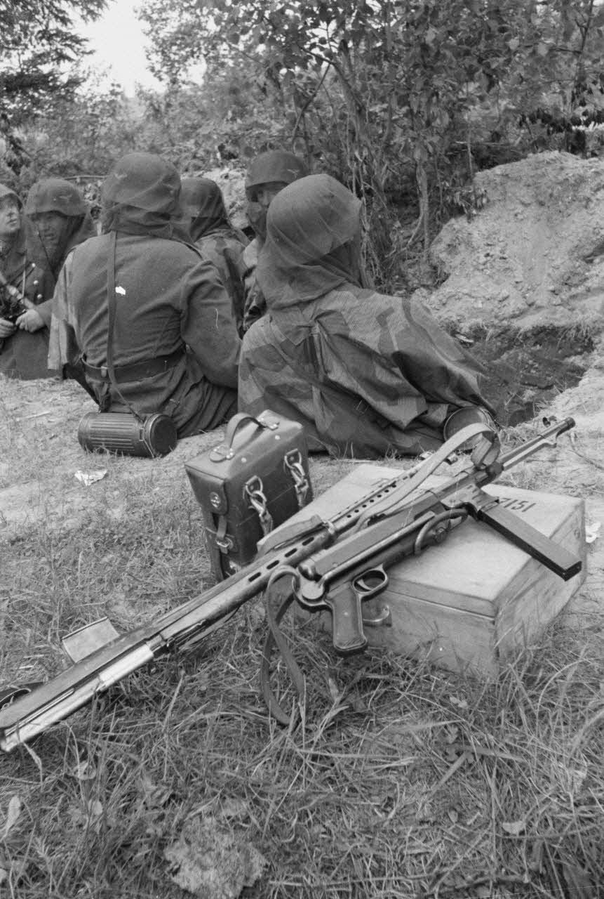 Les servants de cette pièce de 3,7 cm FlaK sont guidés par un télémètre portatif. Un fusil russe capturé Tokarev Svt 40 est comparé au pistolet-mitrailleur allemand MP-40. Dans une tranchée, un reporter de la 1re compagnie de propagande de l'armée de l'air est parmi des fantassins de l'armée de l'air allemande (DAA 2126 L04), on note son appareil photographique Leica. La pièce de DCA est par la suite démontée puis attelée pour le transport.