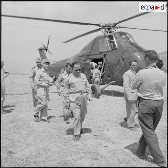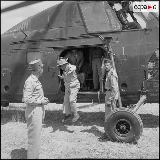 Descente d'hélicoptère de monsieur Robert Lacoste et monsieur Max Lejeune.