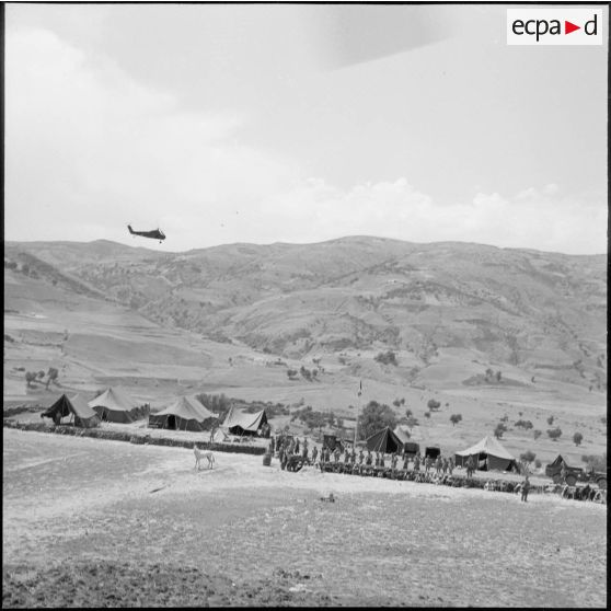 Un hélicoptère Sikorsky S58 survolant le poste du 6e régiment d'infantere (RI) installé à Senedja.