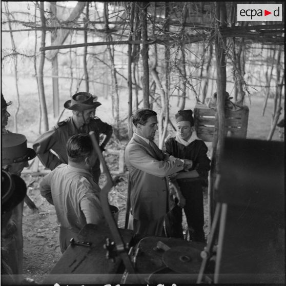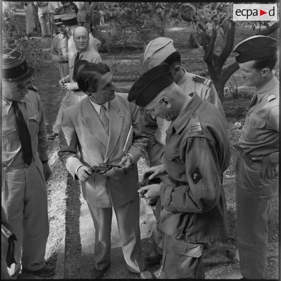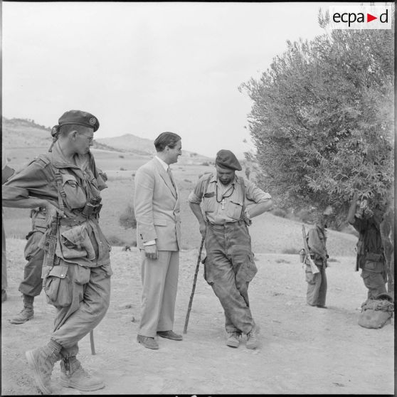 Monsieur Max Lejeune, secrétaire d'état aux forces armées en conversation avec l'aumônier du 14e régiment de chasseurs parachutistes (RCP).