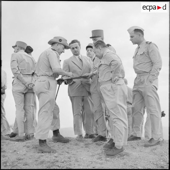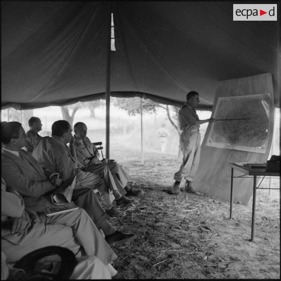 Le général Simon, commandant la 20e DI détaillant les opérations aux autorités civiles et militaires.