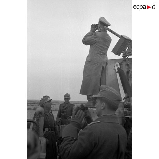Le général Erwin Rommel observe le terrain à la jumelle, debout sur un char britannique M3.