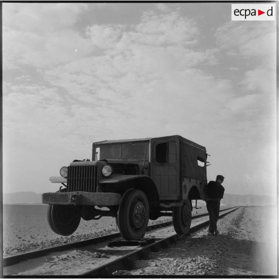 Une Jeep "montée sur rail", soulevée par un vérin hydraulique.