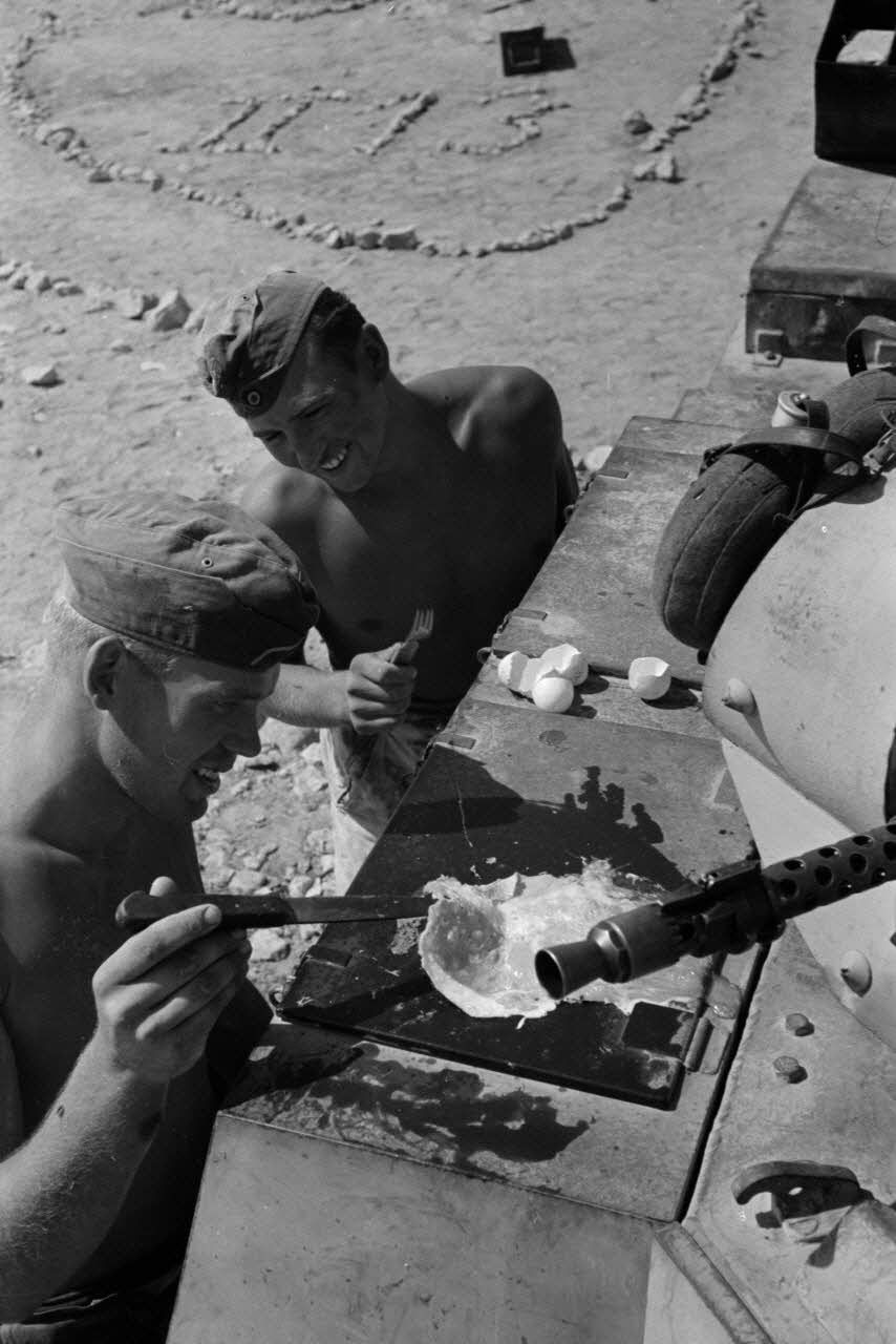 Note : Légende d'origine de l'image DAK 25 L16 publiée dans le "BIZ" (Berliner Illustrierte Zeitung) numéro 38 du 18/09/1941 : "Afrikas Sonne brät Spiegeleier. Nach einem Rezept aus dem Kochbuch des Afrikakorps: Man nehme ein paar Eier, Fett, Salz und ... einen Panzer, auf dessen heißgewordenen Platten sich Mittags in der Wüste herrliche Spiegeleier braten lassen." date de publication : 11/10/1941.