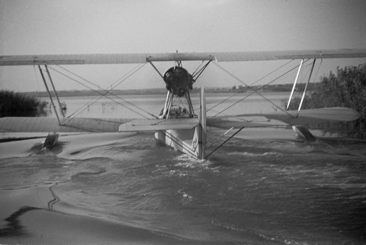 Un tableau en ardoise présente le programme des activités du 7 septembre 1942. Un mécanicien roumain approvisionne l'arme de bord d'un hydravion Heinkel He-114 de l'armée de l'air roumaine. Un pilote roumain s'équipe pour une mission. Un hydravion aux couleurs roumaines, il pourrait s'agir d'un Savoia Marchetti S.59. Un hydravion Heinkel He-114 à quai. Un hydravion roumain quitte son port. Un pilote roumain avec un fusil de chasse. Décollage de deux hydravions Heinkel He-114, un exemplaire roumain et un Heinkel He-59 de la Luftwaffe. Un membre de la 9e escadrille de chasse roumaine, comme l'atteste le trèflle cousu sur sa poitrine. Peut-être un photographe de l'armée de l'air roumaine, ou simplement un officier équipé d'un boitier photographique. Le même officier portant un appareil photo et saluant le reporter lors du décollage. Vue aérienne du terrain et des hangars lors du décollage. On reconnaît distinctement les hangars caractéristiques du terrain de Mamaia.
