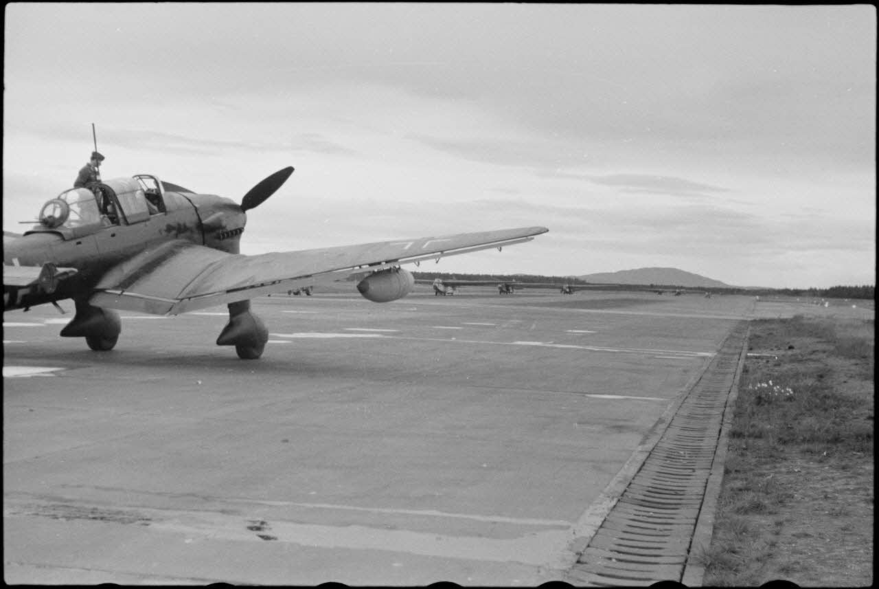 Sur l'aérodrome de Banak (secteur de Trondheim), un pilote de Junkers Ju-87 lors de manœuvres du 8./LLG 1 (Lulftlandegeschwader 1).