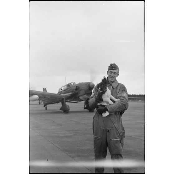Un adjudant en tenue de vol (grade cousu sur les manche de sa combinaison) caresse un chien (la mascotte de l'escadrille). En arrière-plan, un remorqueur Junkers Ju-87 Stuka fait "chauffer" son moteur.