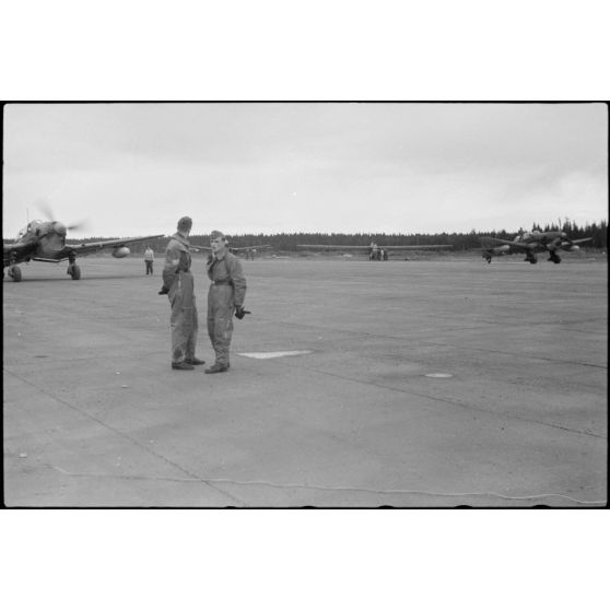 Sur l'aérodrome de Banak (secteur de Trondheim), deux pilotes de Junkers Ju-87 Stuka lors de manœuvres du 8./LLG 1 (Lulftlandegeschwader 1).