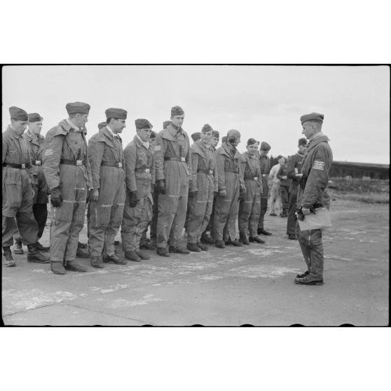 Lors de manœuvres sur le terrain d'aviation de Banak en Norvège, un capitaine du 8./LLG 1 (Lulftlandegeschwader 1) devant des pilotes de Junkers Ju-87 Stuka.