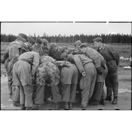 Des pilotes de Junkers Ju-87 Stuka et des équipages de planeurs du 8./LLG 1 (Lulftlandegeschwader 1) peu avant une manoeuvre depuis le terrain d'aviation de Banak.