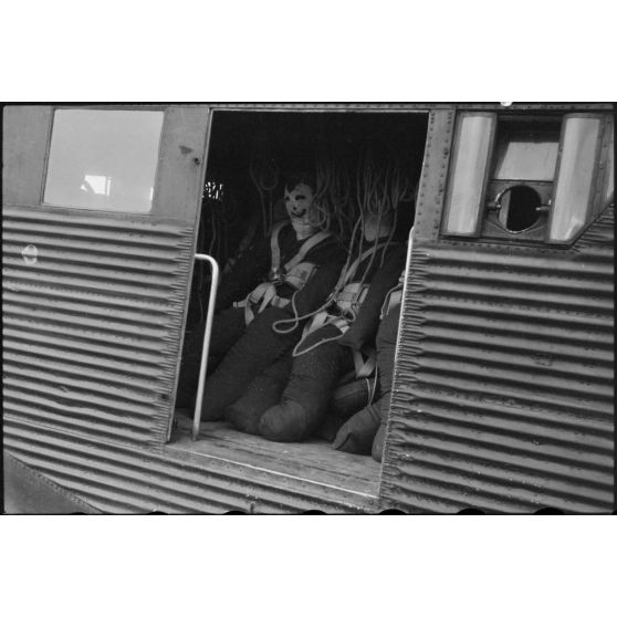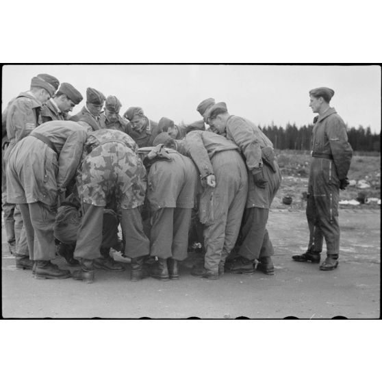Le même adjudant procède à une revue, l'équipage d'un planeur DFS-230 présente l'équipement de survie (parachutes, fusées de détresse).