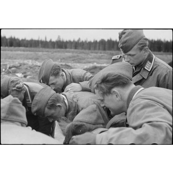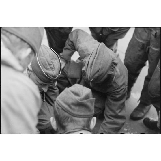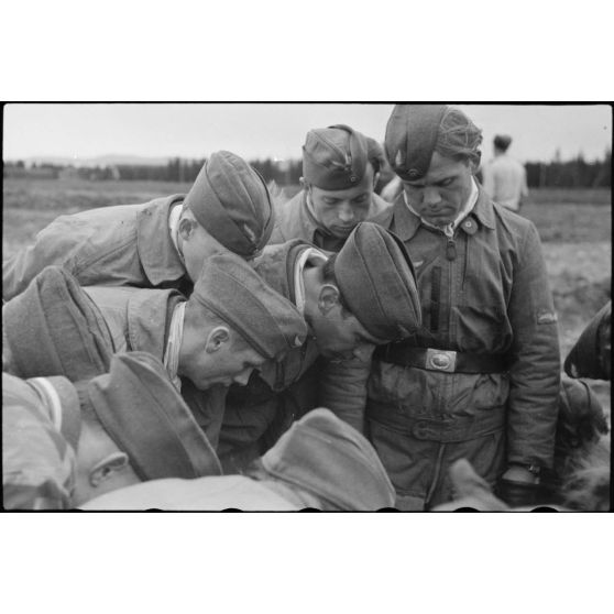 Sur le terrain d'aviation de Banak occupé par le 8./LLG 1 (Lulftlandegeschwader 1), un adjudant (Feldwebel) vérifie le paquetage des équipages de Stuka ou de planeurs DFS-230.
