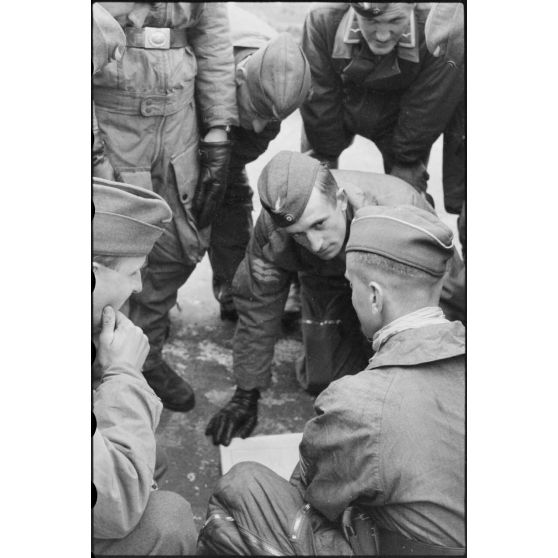 Un briefing de pilotes de Junkers Ju-87 et d'équipages de planeurs DFS-230 du 8./LLG 1 (Lulftlandegeschwader 1) sur l'aérodrome de Banak (secteur de Trondheim).