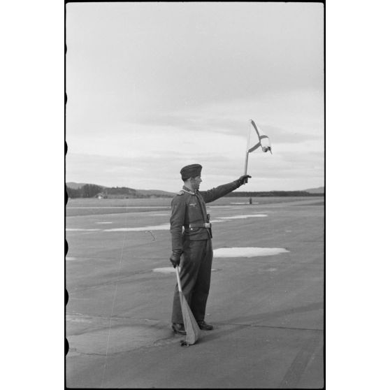 En Norvège, sur le terrain de Banak où stationne le 8./LLG 1 (Lulftlandegeschwader 1), un adjudant-chef (Oberfeldwebel) donne le signal du décollage des avions.