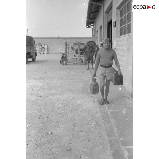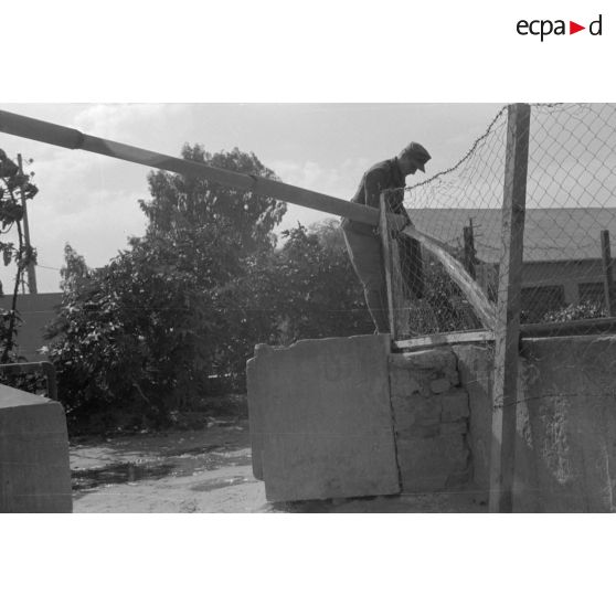 En Libye, un lieu de stockage d'eau dans une ville. Chargement d'un camion en jerrycan d'eau.