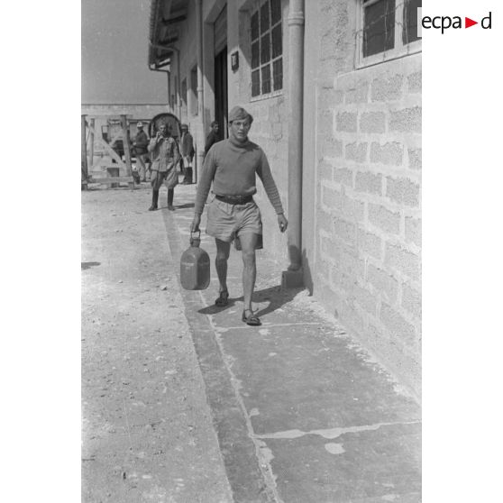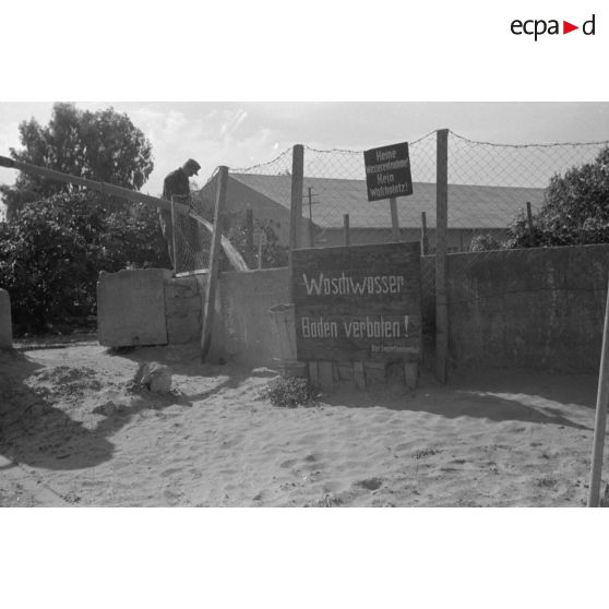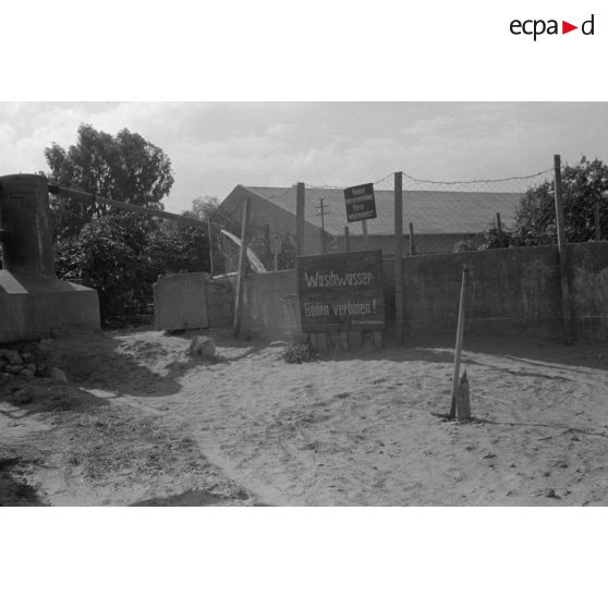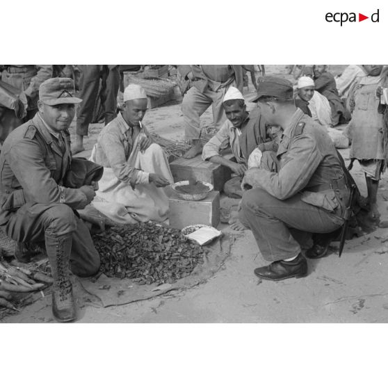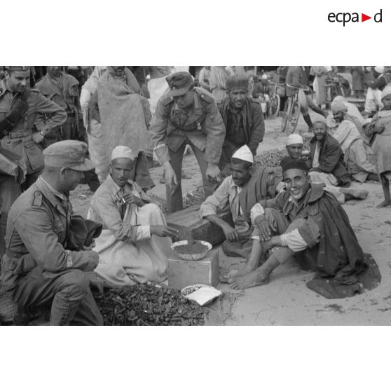Deux soldats allemands dans un marché, on remarque la bande de bras Afrikakorps sur le bras droit du soldat de gauche.