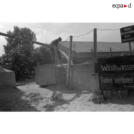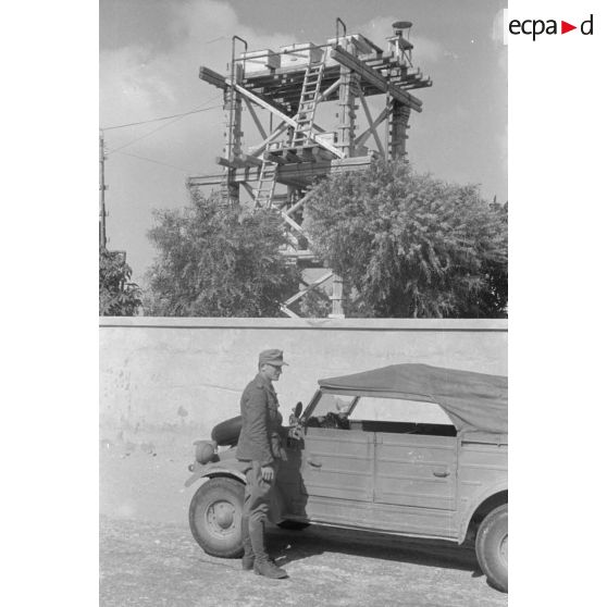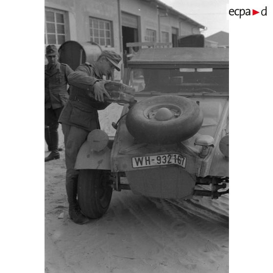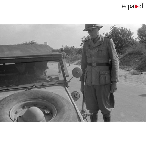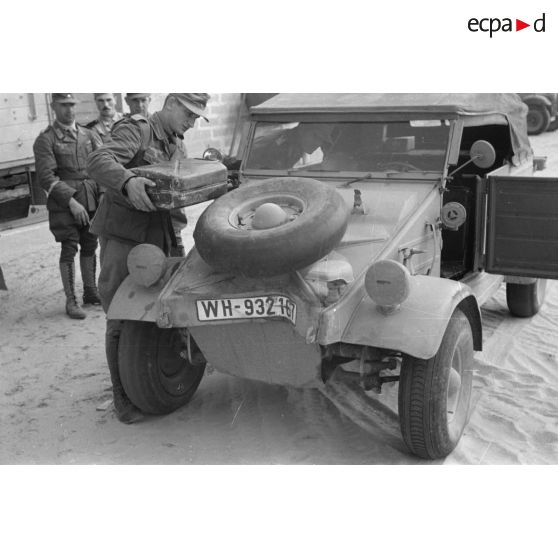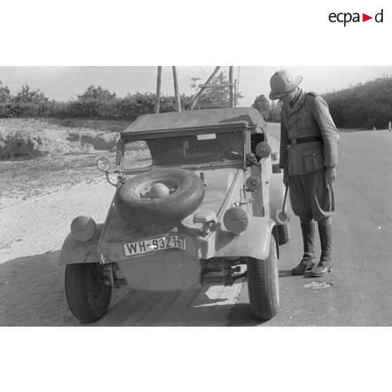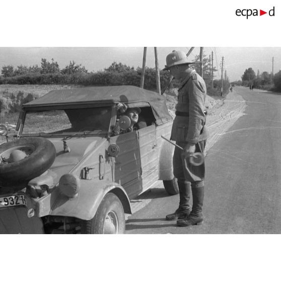 Un Feldgendarme contrôle une Volkswagen Kübelwagen immatriculée WH-932 167.