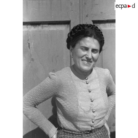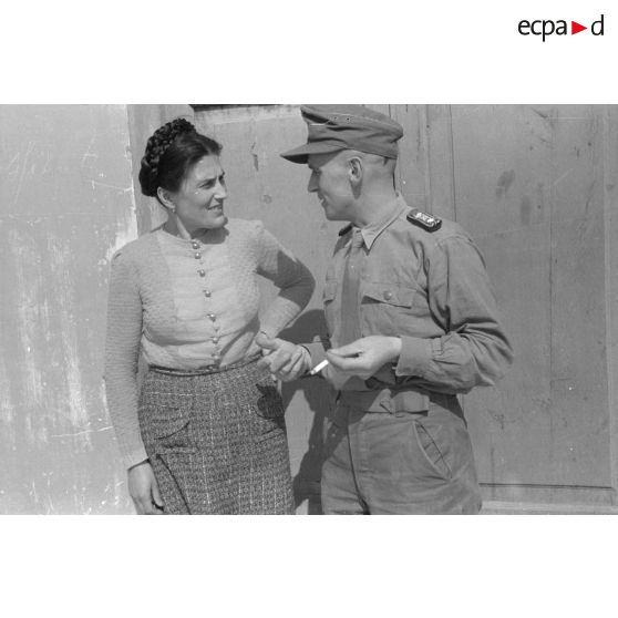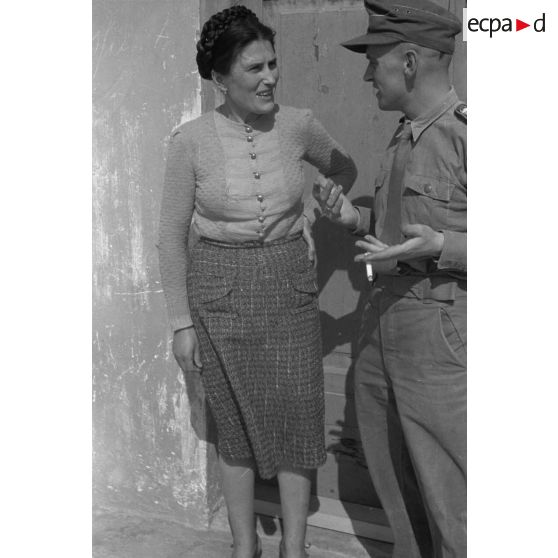 Un officier s'entretient avec une femme, il pourrait s'agir d'un responsable d'atelier allemand (Heereswerkmeister).