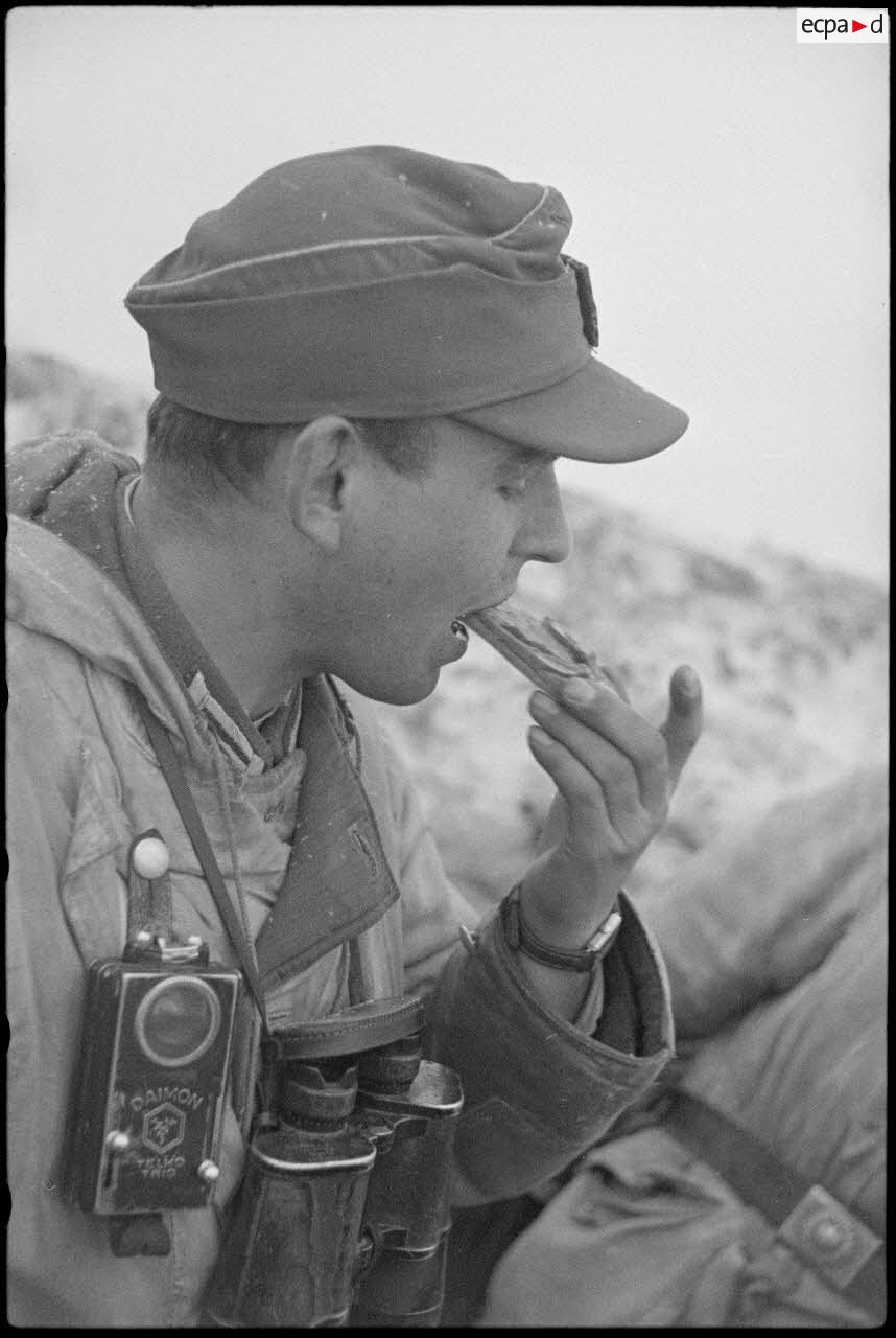 Un lieutenant (Leutnant) d'une unité de Panzergrenadier coupe une tranche de pain noir.