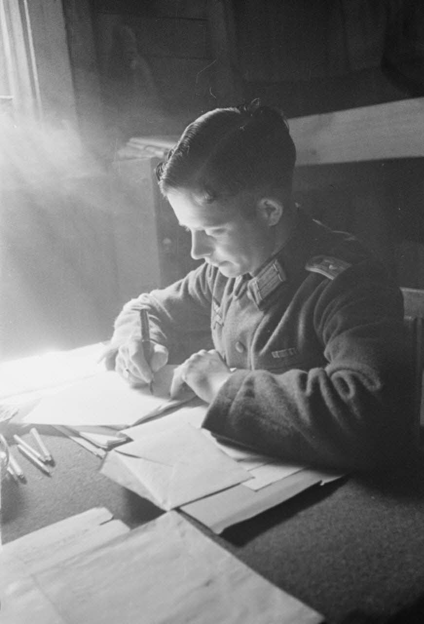 Devant une isba, une photographie de groupe d'officiers (DAT 1270 L04). A l'intérieur d'une isba se tient une réunion entre les officiers allemands (DAT 1270 L04A). Un lieutenant rédige un courrier à un hypothétique "Herr Müller". Cette lettre lui apprend la mort de son fils survenue le 14 mars 1943 sur le front de l'Est.