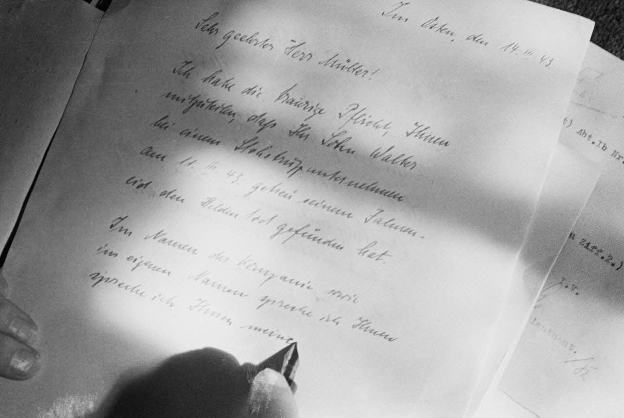 Ich habe die traurige Pflicht, Ihnen mitzuteilen, dass Ihr Sohn Walter bei ein Stohstruppunternehmen am 11.III.43 gehen seinem Fahnen[??] dem Heldentod gefunden hat.