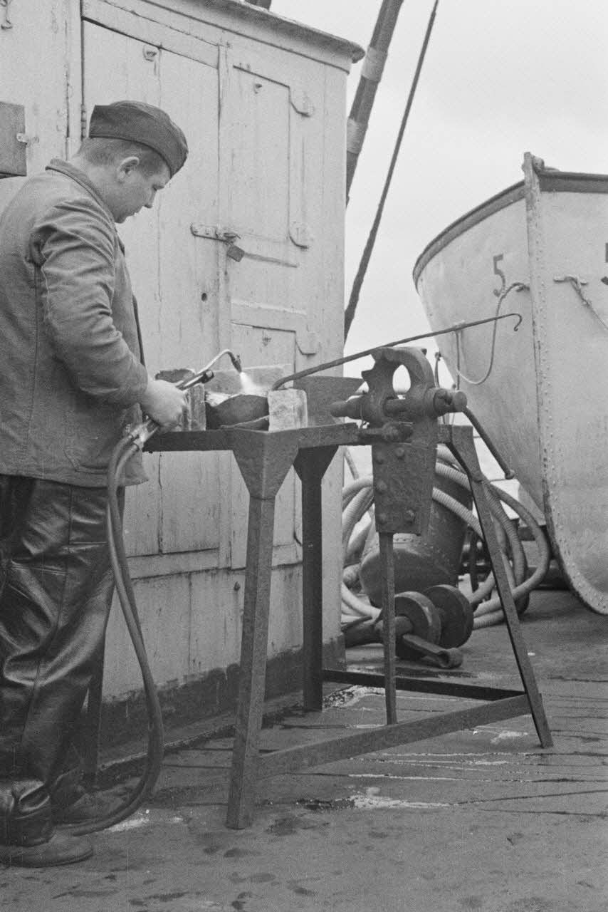 Un marin allemand effectue une soudure à bord d'un dragueur de mines du type Sperrbrecher (briseur de blocus).
