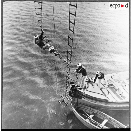 Des marins empruntent une échelle de tangon pour monter à bord d'un navire.