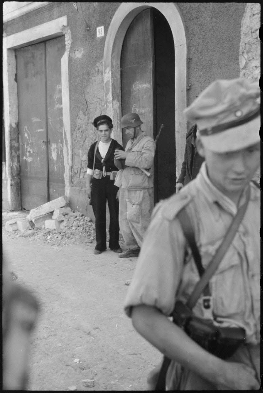 Un marin italien et des fantassins du Panzer-Grenadier-Regiment Hermann Goering dans une rue de Catane (Sicile).