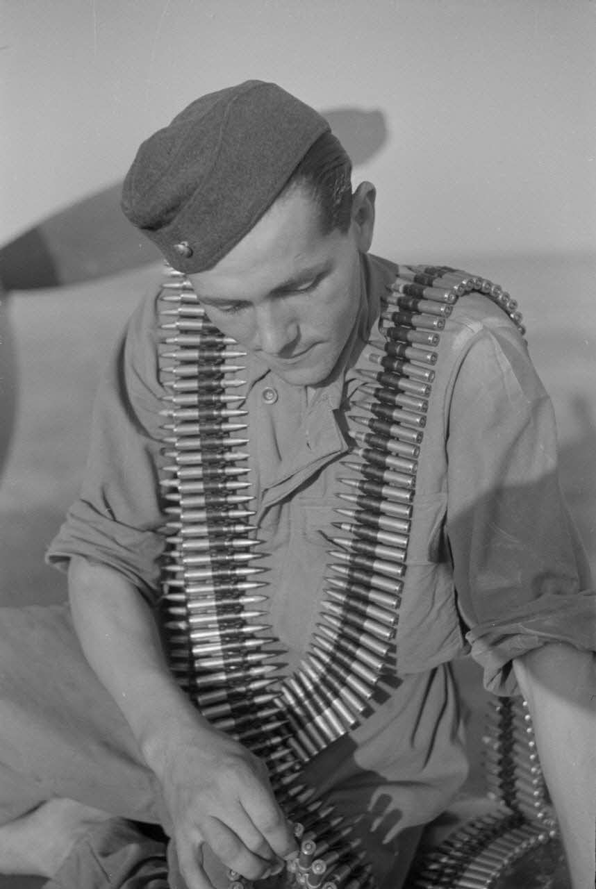 Un mécanicien approvisionne les mitrailleuses d'un Heinkel He-114 roumain pour une mission de bombardement du Grupul 9.