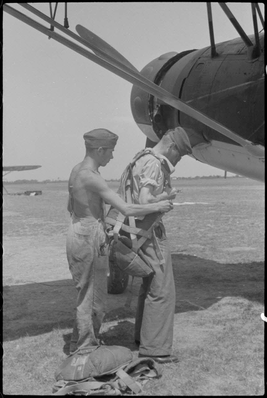 Un mécanicien de la 1re escadre aéroportée (Luftlandegeschwader 1) aide un pilote à s'équiper de son parachute avant qu'il monte dans un Henschel Hs-126.