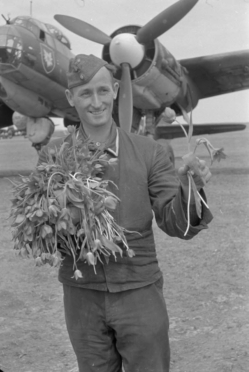Un mécanicien du 4./KG 51 accueille un équipage de bombardier Junkers Ju-88 avec des fleurs.