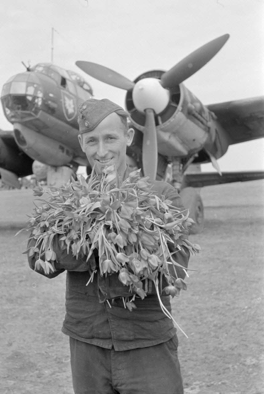 Un mécanicien du 4./KG 51 accueille un équipage de bombardier Junkers Ju-88 avec des fleurs.