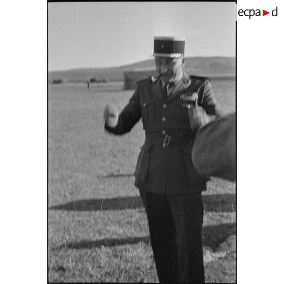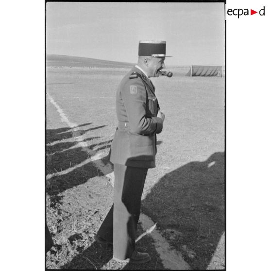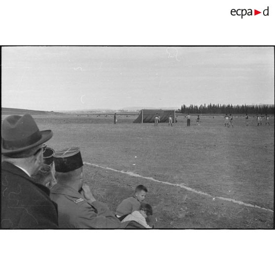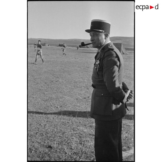 Match de football à la ferme expérimentale. Portrait d'un officier au cours du match de football.