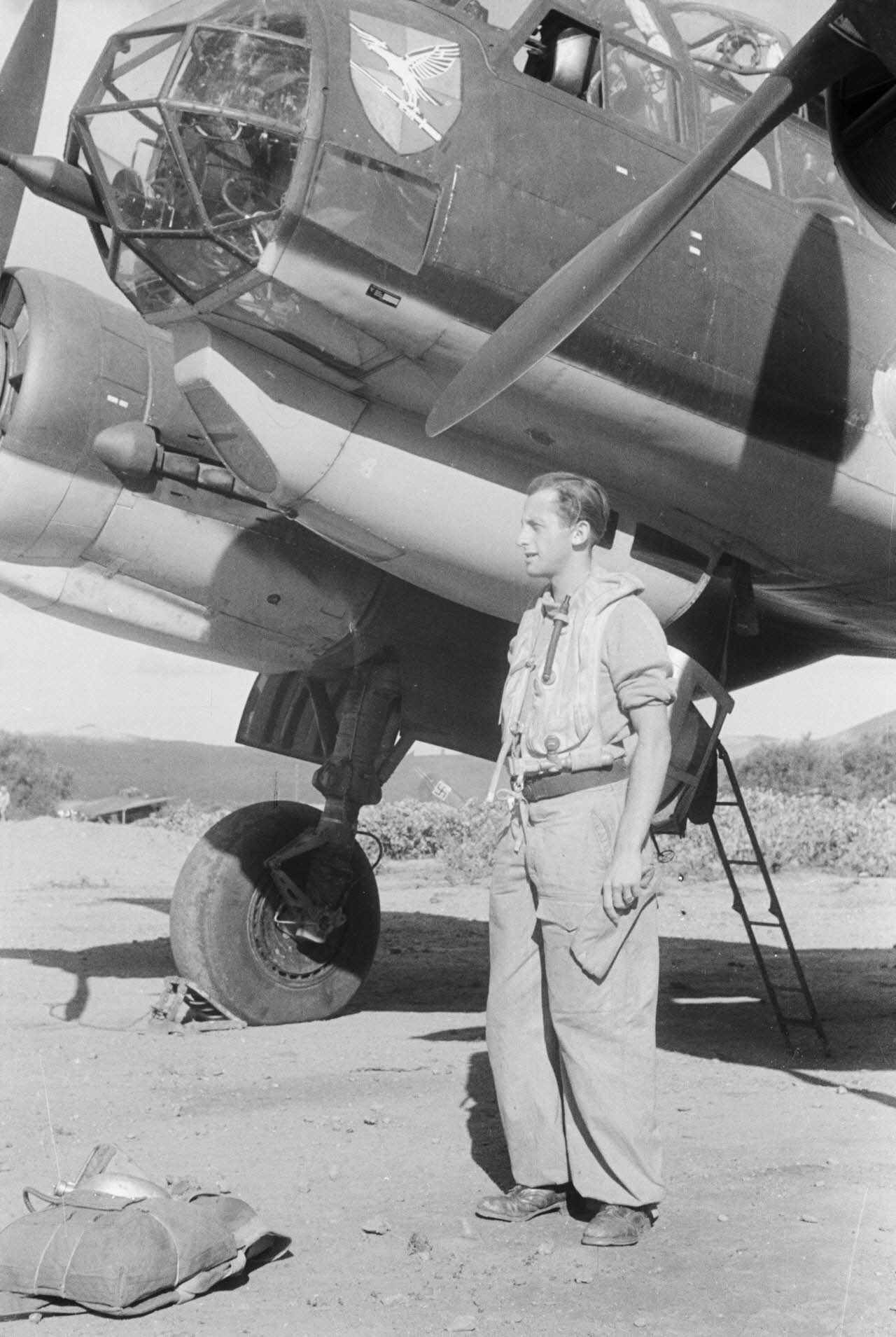 Un membre d'équipage de bimoteur Junkers Ju-88 du Aufklärungsgruppe 123 dont l'insigne est reproduit sur le nez de l'appareil.