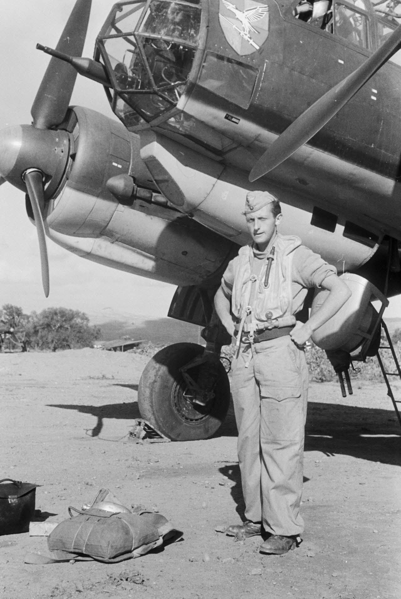 Un membre d'équipage de bimoteur Junkers Ju-88 du Aufklärungsgruppe 123 dont l'insigne est reproduit sur le nez de l'appareil.