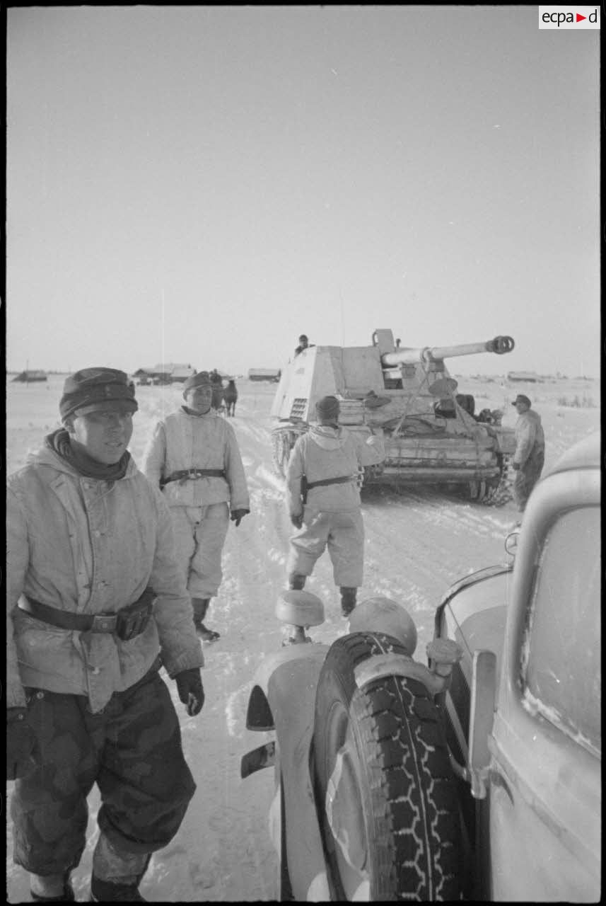 Un Nashorn (Sd.kfz.164) progresse sur une route enneigée. Un Sd.kfz.124 "Wespe" embourbé, a été abandonné par son équipage. Le passage d'un petit pont de bois demande le soutien de fantassins allemands, les camions l'empruntent également avec prudence. Des fantassins allemands progressent lentement sous la couverture des tirs des Nashorn baptisés "Ostpreussen" et "Goliath" (?). Le reporter est monté à bord d'un des canons automoteurs et immortalise les compartiments pour les obus de 8,8 cm pour le canon Pak 41/43 et quelques tirs. Après quelques salves, deux équipages se rassemblent pour fumer. Portraits de fantassins.