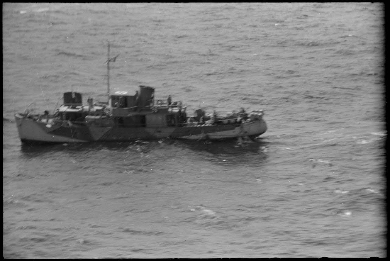 Un navire de petite taille appartenant à la Kriegsmarine navigue autour du navire qui sombre.