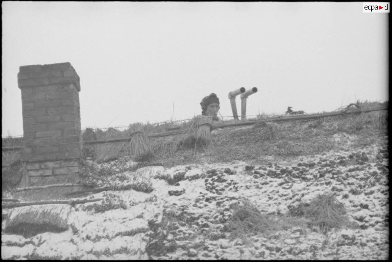 Un observateur doté de jumelles guide la batterie d'artillerie.