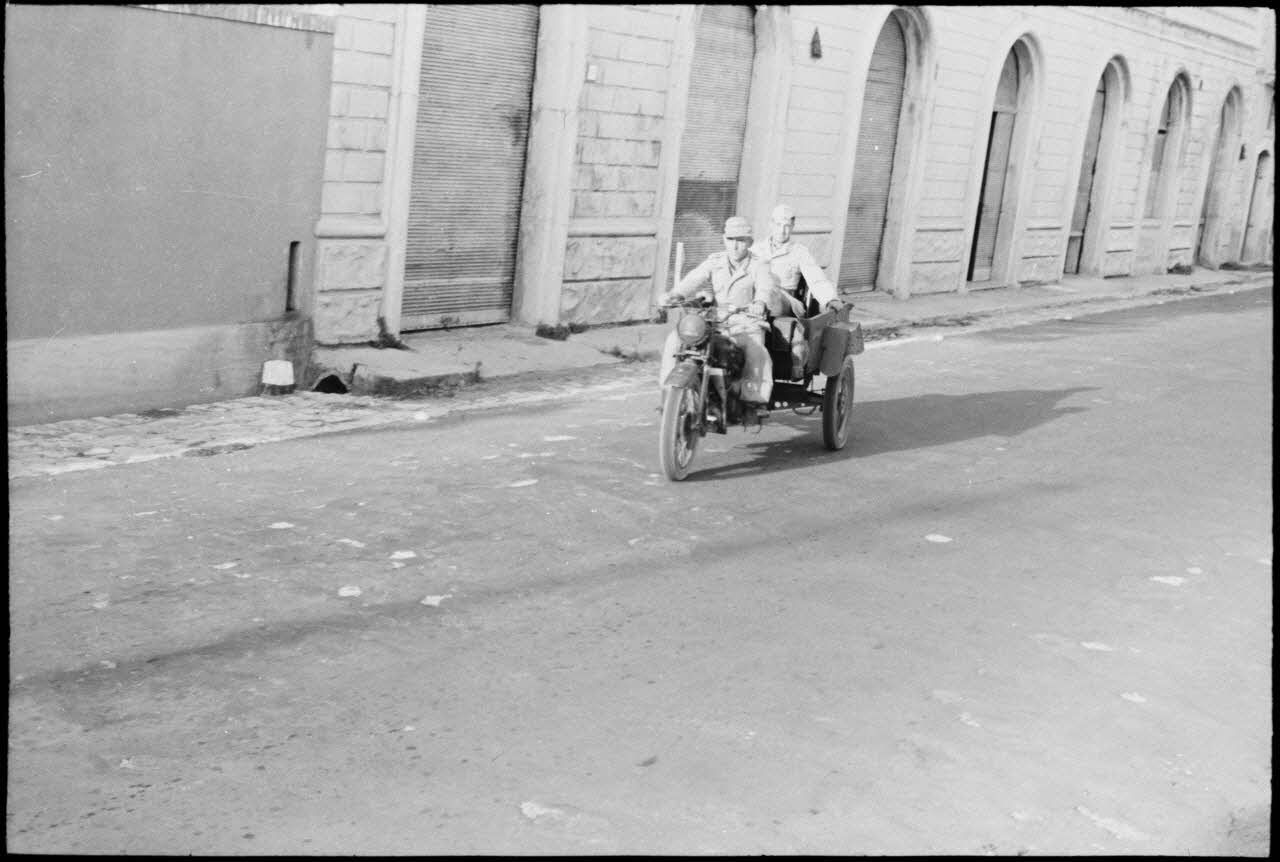 Un officier à bord d'un tricycle de la marque Moto Guzzi Alce baptisé "Sturmvogel".