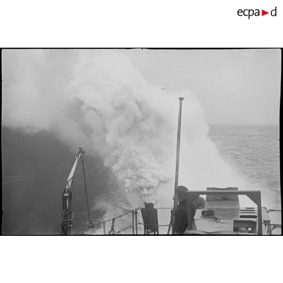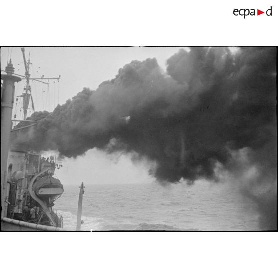 Fumée s'échappant d'une cheminée d'un torpilleur, le Bouclier ou le Flore.