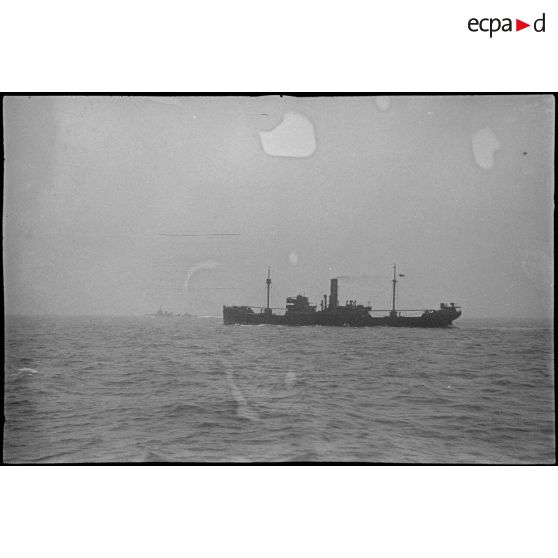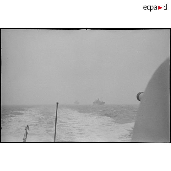 Convoi de navires marchands escorté par des torpilleurs de la Marine nationale.