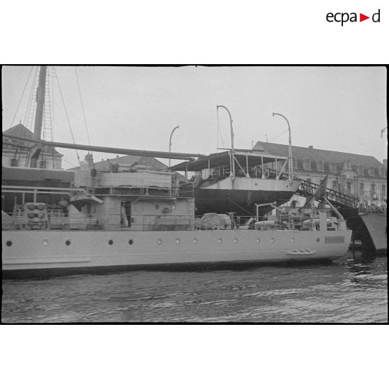 Vue arrière bâbord de l'aviso Cheveuil, au mouillage dans un port.