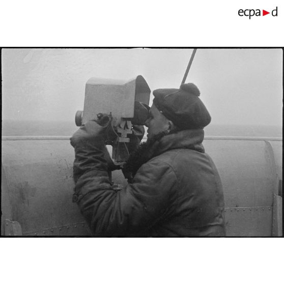 Marin de guet à la jumelle à bord d'un torpilleur, le Bouclier ou la Flore.
