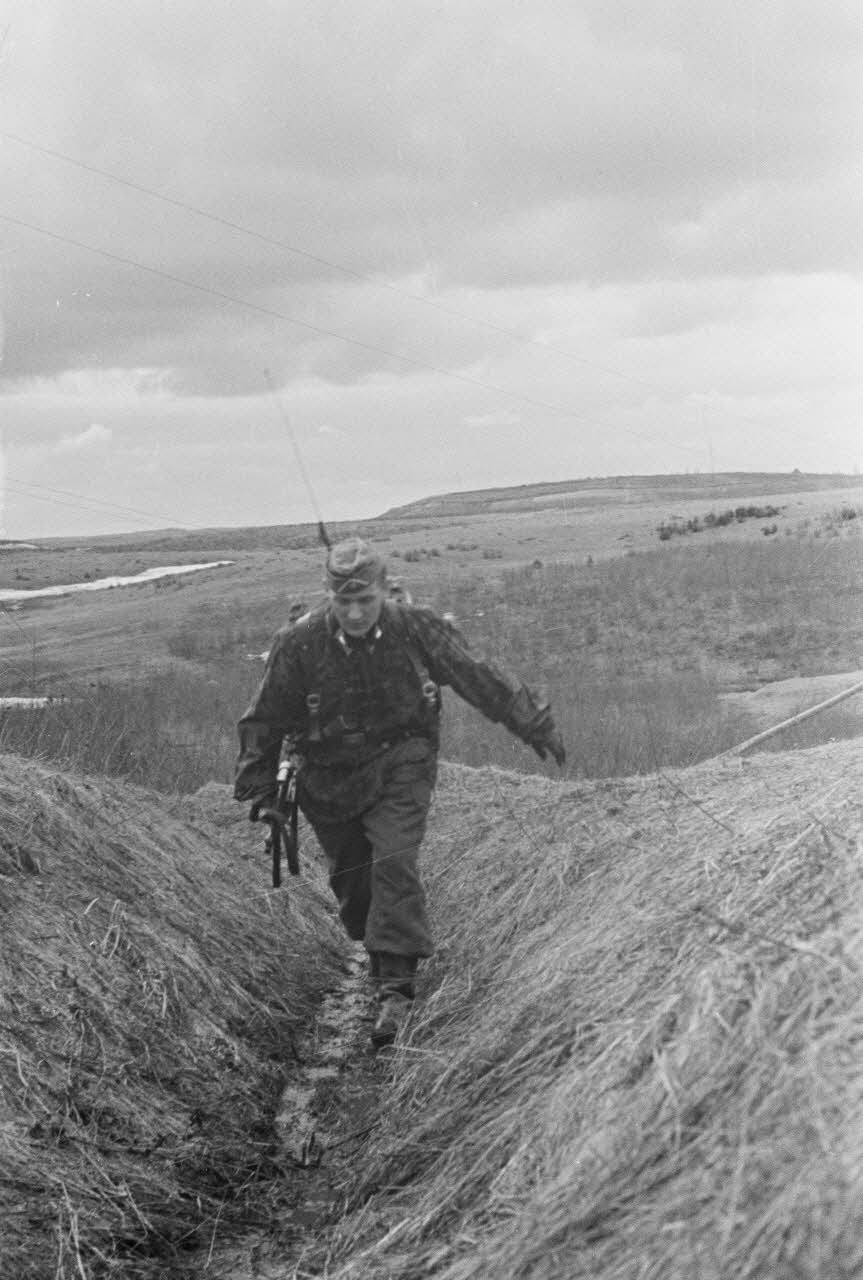 Une patrouille allemande, et au centre un officier d'infanterie équipé du poste émetteur-récepteur (Feldfunksprecher b1 Feldfu.b1).