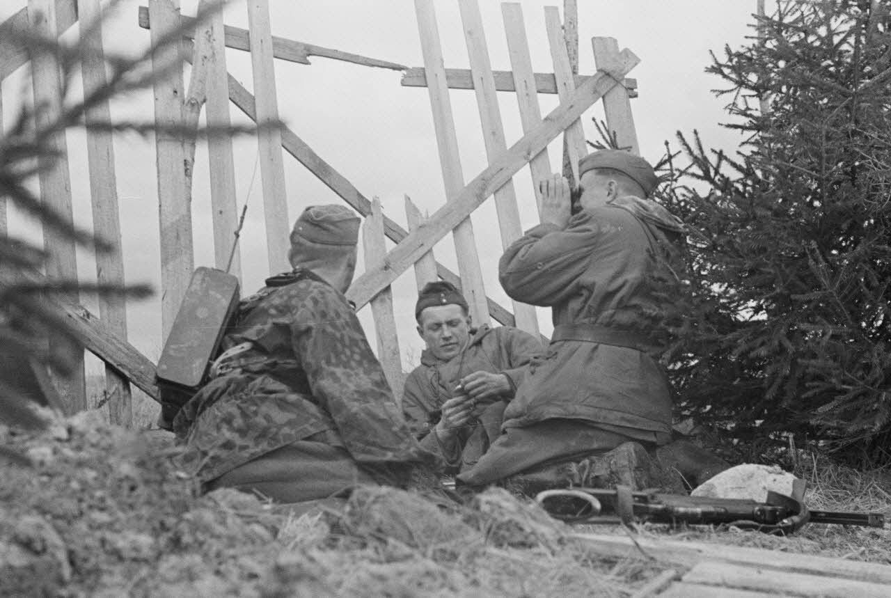 Lors d'une patrouille, des fantassins allemands qui viennent de traverser une rivière doivent changer de chaussettes.