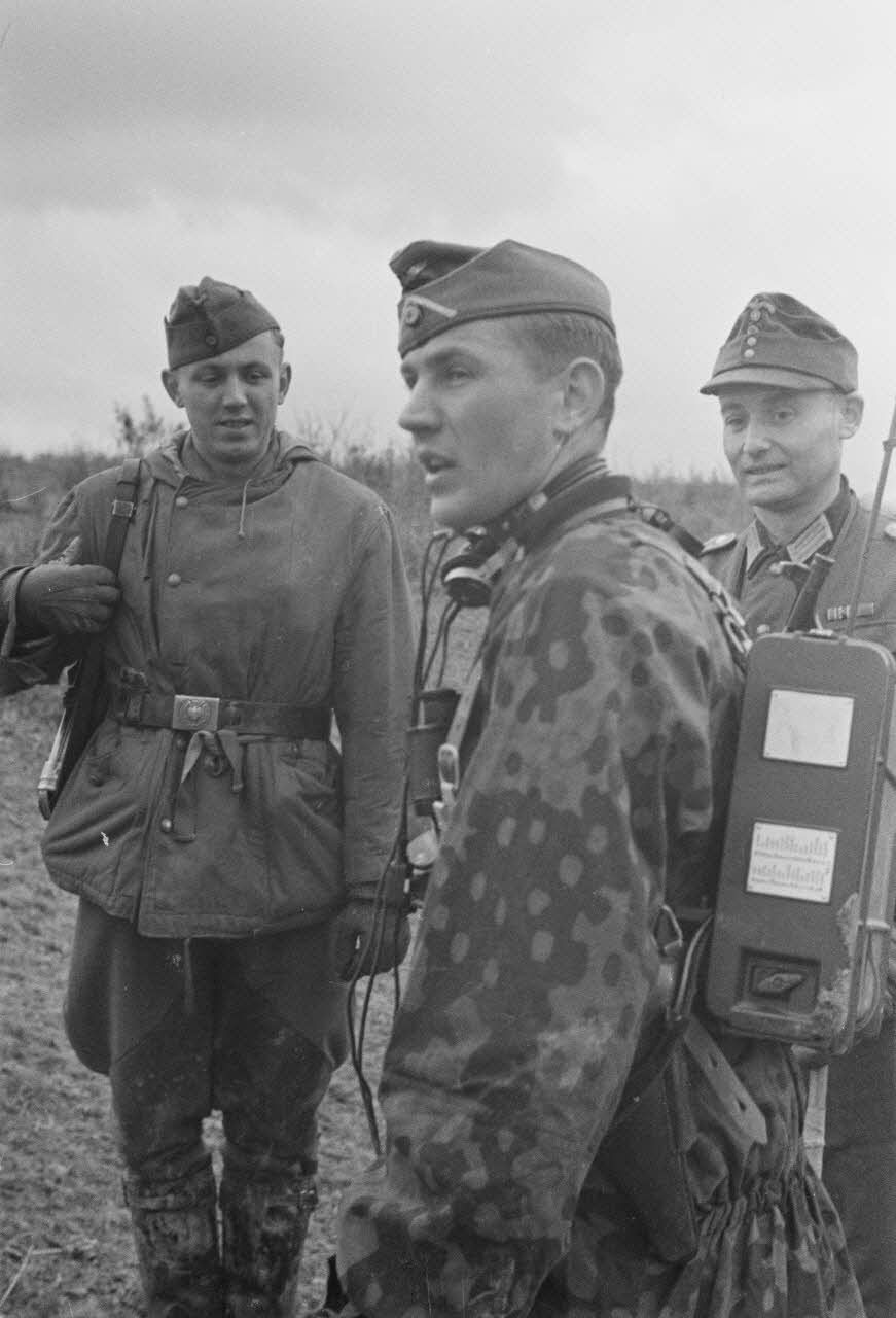 Une patrouille allemande, et au centre un officier d'infanterie équipé du poste émetteur-récepteur (Feldfunksprecher b1 Feldfu.b1).