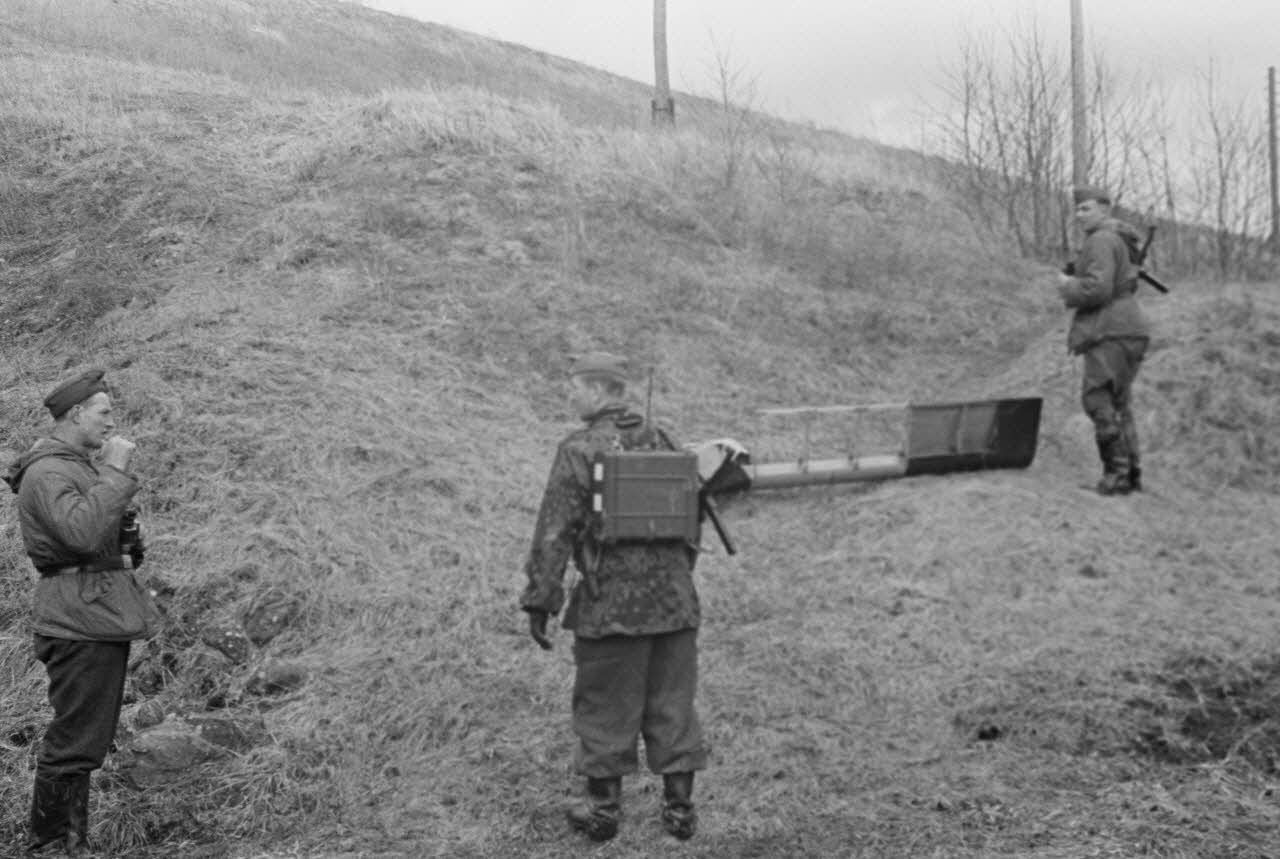 Une patrouille allemande, et au centre un officier d'infanterie équipé du poste émetteur-récepteur (Feldfunksprecher b1 Feldfu.b1).
