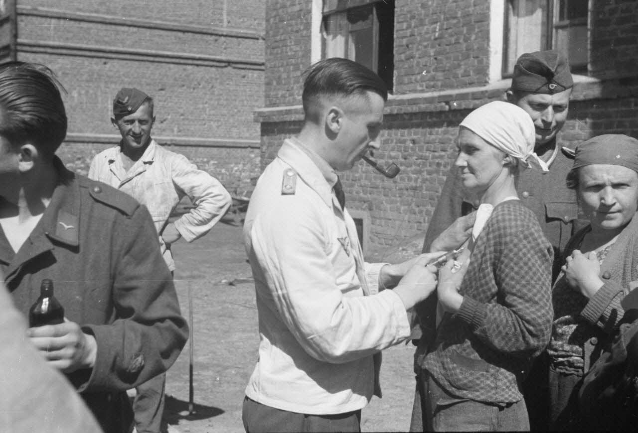 Un officier de l'armée de l'air allemande (peut-être un médecin) fait une injection à une femme.