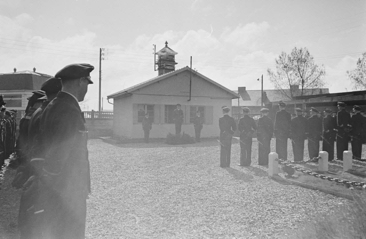 Des officiers et les marins de la Kriegsmarine sont au garde-à-vous.