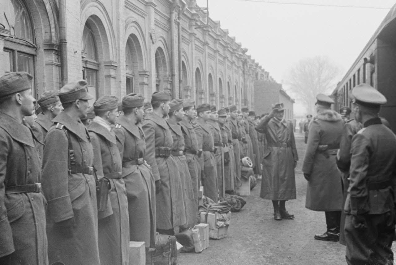 Informations quant aux lieux renseignés dans ce reportage : les soldats vont ou reviennent d'une permission, le lieu peut être en Pologne annexée ou sur le front de l'Est.